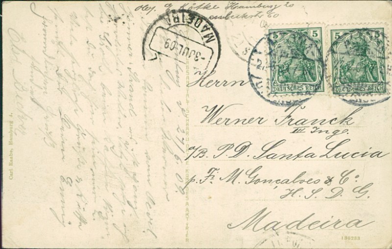 Alte Ansichtskarte aus Hamburg-Blankenese, gelaufen am 27.06.1909 von Altona nach Madeira. Ankunft in Madeira am 03.07.1909.