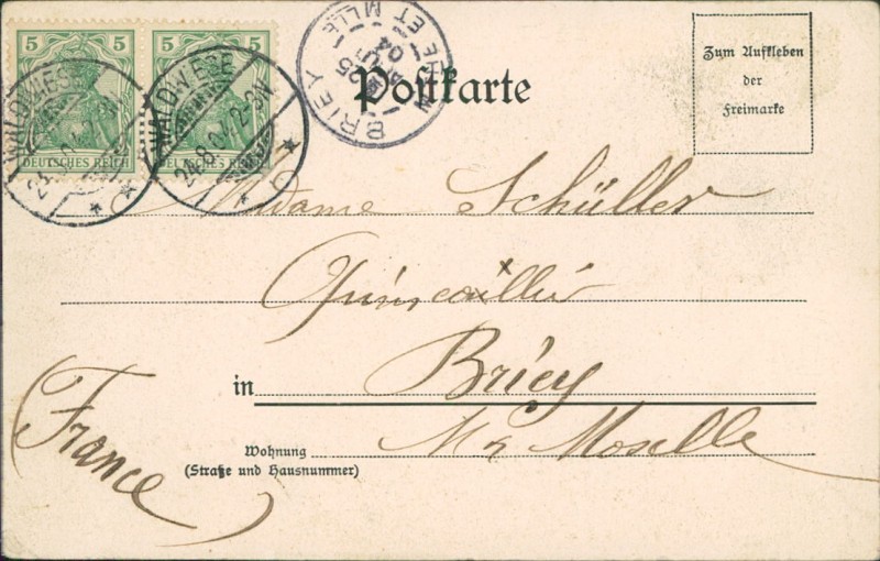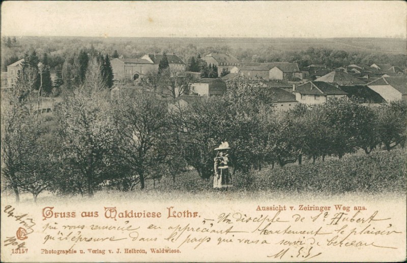 Alte Ansichtskarte aus Waldwiese / Waldwisse, gelaufen am 24.08.1904 von Waldwiese nach Briey. Ankunft in Briey am 25.08.1904.