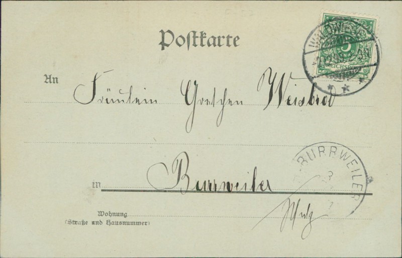 Alte Ansichtskarte aus Waldwiese / Waldwisse, gelaufen am 02.12.1899 von Waldwiese nach Burrweiler. Ankunft in Burrweiler am 03.12.1899.