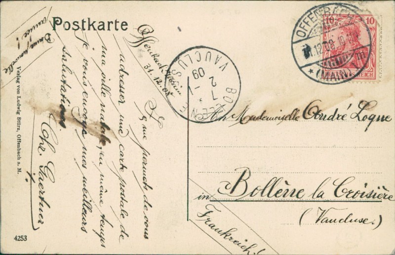Alte Ansichtskarte aus Offenbach am Main, gelaufen am 31.12.1908 von Offenbach (Main) nach Bollène (Vaucluse). Ankunft in Bollène (Vaucluse) am 02.01.1909.