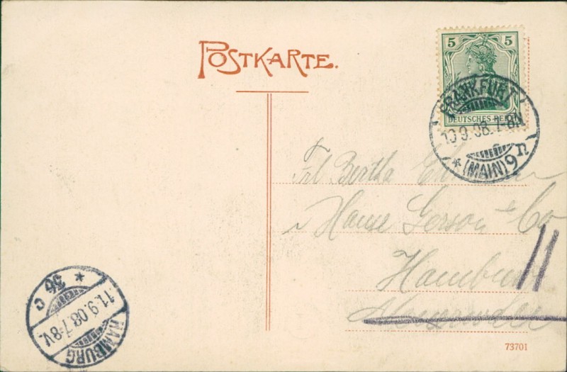 Alte Ansichtskarte aus Offenbach am Main, gelaufen am 10.09.1908 von Offenbach (Main) nach Hamburg. Ankunft in Hamburg am 11.09.1908.
