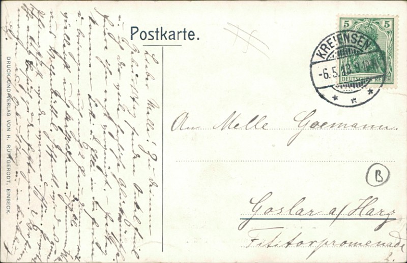 Alte Ansichtskarte aus Greene, gelaufen am 06.05.1913 von Kreiensen nach Goslar.