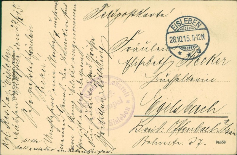 Alte Ansichtskarte aus Eisleben, gelaufen am 28.10.1915 von Eisleben nach Egelsbach.