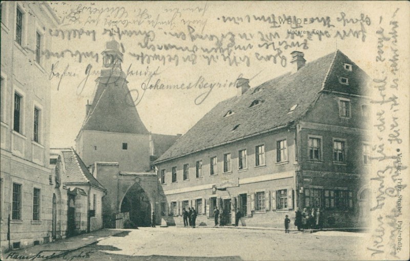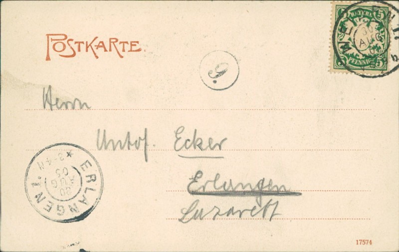 Alte Ansichtskarte aus Weiden i.d.OPf., gelaufen am 30.08.1905 von Weiden nach Erlangen. Ankunft in Erlangen am 30.08.1905.