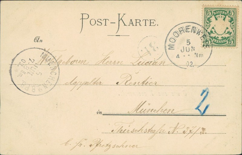 Alte Ansichtskarte aus Moorenweis, gelaufen am 05.06.1902 von Moorenweis nach München. Ankunft in München am 05.06.1902.