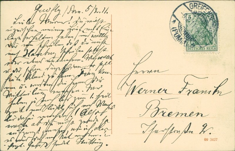 Alte Ansichtskarte aus Greifenberg / Gryfice, gelaufen am 06.02.1911 von Greifenberg (Pomm.) nach Bremen.