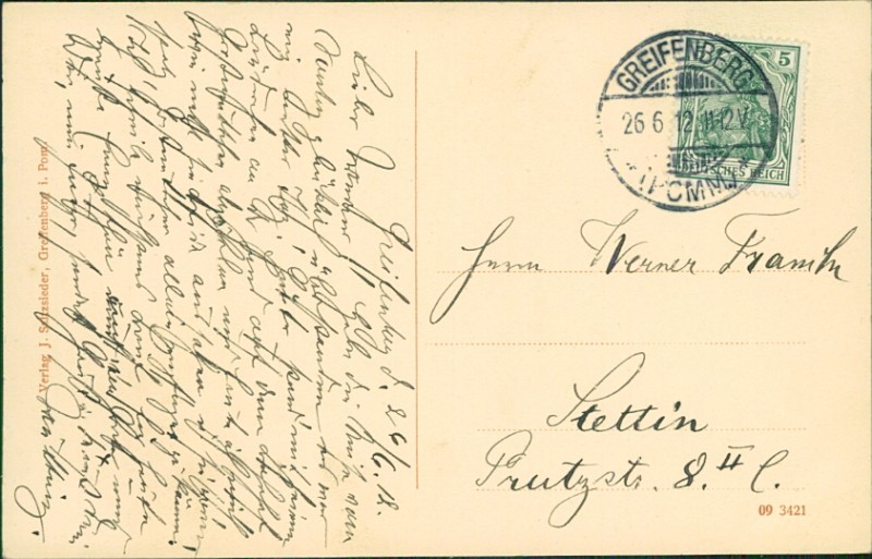 Alte Ansichtskarte aus Greifenberg / Gryfice, gelaufen am 26.06.1912 von Greifenberg (Pomm.) nach Stettin.