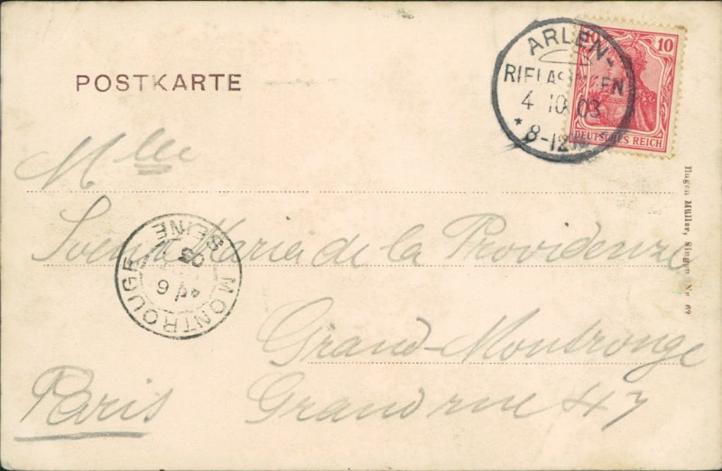 Alte Ansichtskarte aus Rielasingen-Worblingen, gelaufen am 04.10.1903 von Arlen-Rielasingen nach Grand-Montrouge.