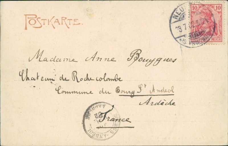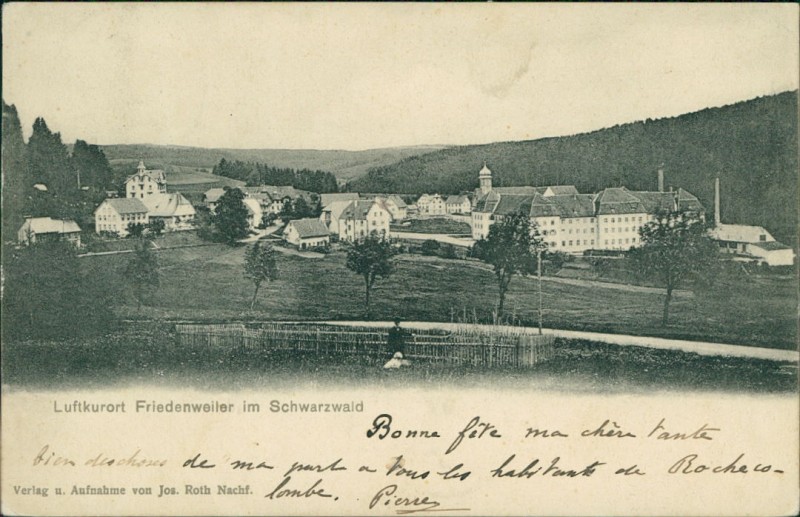 Alte Ansichtskarte aus Friedenweiler, gelaufen am 03.07.1902 von Neustadt (Schwarzwald) nach Bourg St. Andéol.