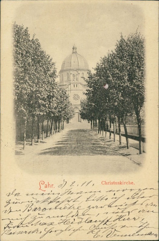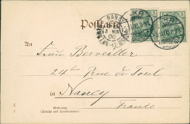 Alte Ansichtskarte aus Lahr/Schwarzwald, gelaufen am 02.11.1900 von Lahr nach Nancy. Ankunft in Nancy am 03.11.1900.
