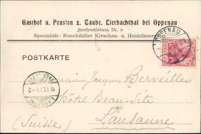 Alte Ansichtskarte aus Oppenau, gelaufen am 16.07.1903 von Oppenau nach Lausanne. Ankunft in Lausanne am 16.07.1903.