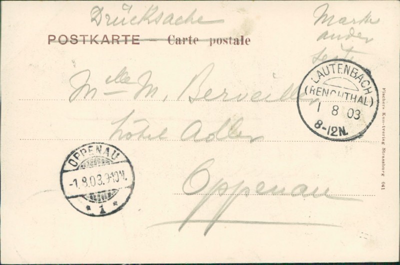 Alte Ansichtskarte aus Lautenbach, gelaufen am 01.08.1903 von Lautenbach (Renchthal) nach Oppenau. Ankunft in Oppenau am 01.08.1903.