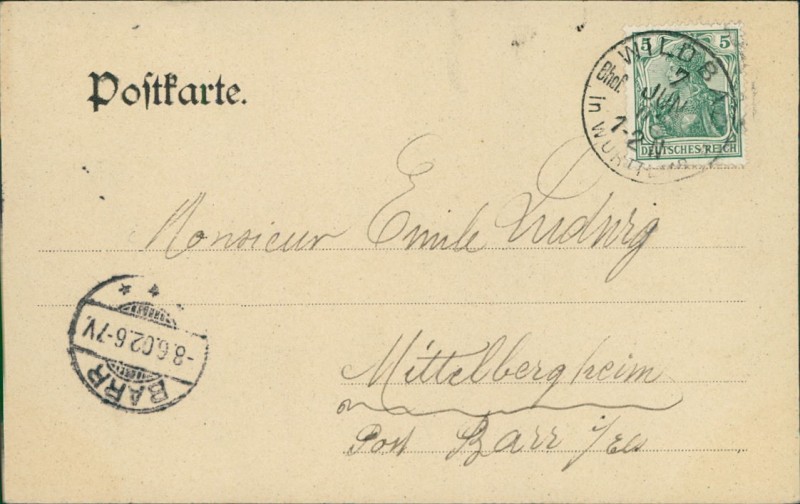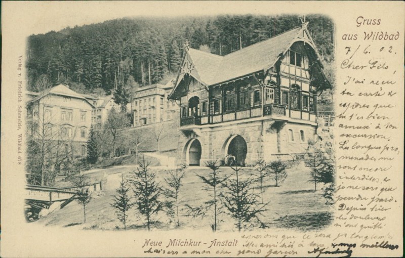 Alte Ansichtskarte aus Bad Wildbad, gelaufen am 07.06.1902 von Wildbad in Württemb. Bhof. nach Barr. Ankunft in Barr am 08.06.1902.