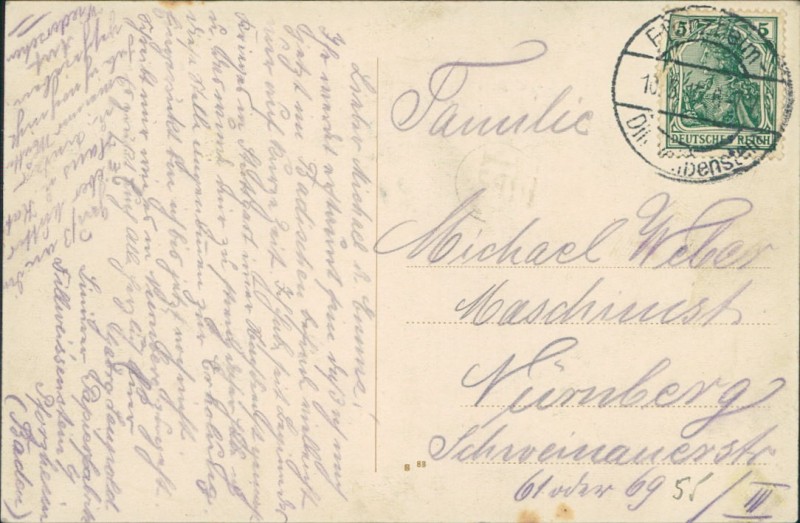 Alte Ansichtskarte aus Pforzheim-Dillweißenstein, gelaufen am 10.05.1915 von Pforzheim-Dillweißenstein nach Nürnberg.