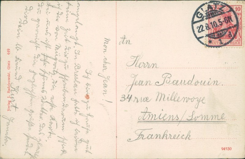 Alte Ansichtskarte aus Glatz / Kłodzko, gelaufen am 22.08.1910 von Glatz nach Amiens.