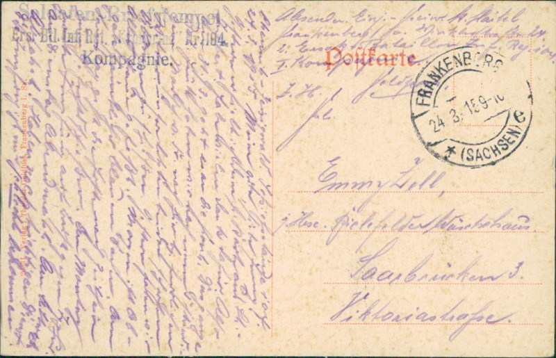 Alte Ansichtskarte aus Niederwiesa, gelaufen am 24.03.1915 von Frankenberg (Sachsen) nach Saarbrücken.