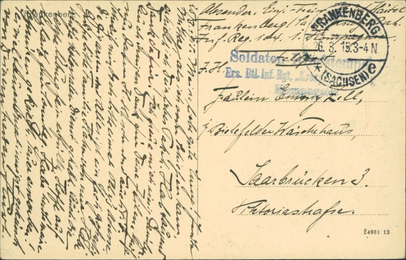 Alte Ansichtskarte aus Frankenberg/Sa., gelaufen am 06.03.1915 von Frankenberg (Sachsen) nach Saarbrücken.