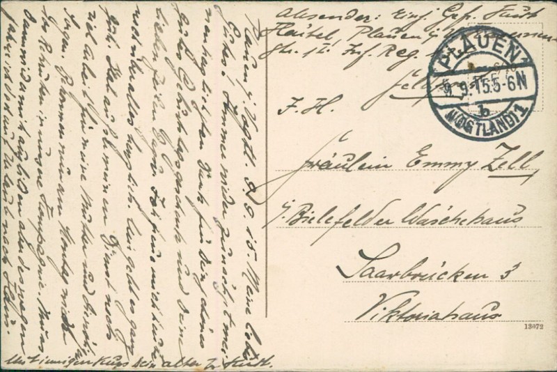 Alte Ansichtskarte aus Plauen, gelaufen am 09.09.1915 von Plauen (Vogtland) nach Saarbrücken.