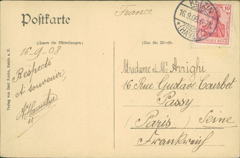 Alte Ansichtskarte aus Ketzin/Havel, gelaufen am 16.09.1908 von Ketzin nach Paris.