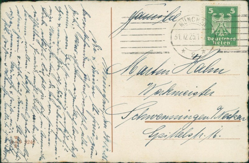 Alte Ansichtskarte, gelaufen am 31.12.1925 von München nach Schwenningen a/Neckar.
