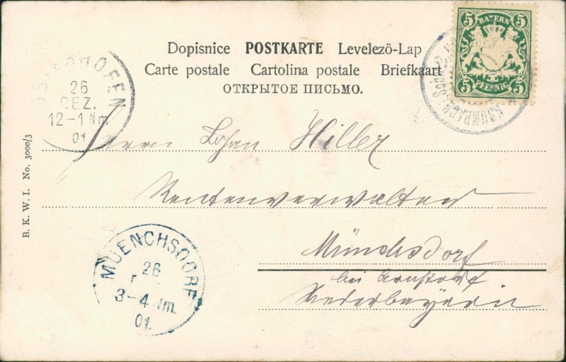Alte Ansichtskarte, gelaufen am 26.12.1901 von Krumbach i. Schw. nach Münchsdorf. Ankunft in Münchsdorf am 26.12.1901.