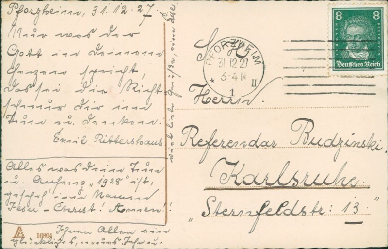 Alte Ansichtskarte, gelaufen am 31.12.1927 von Pforzheim nach Karlsruhe.