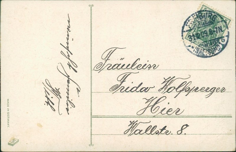 Alte Ansichtskarte, gelaufen am 31.12.1909 von Freiburg (Breisgau) nach Freiburg.