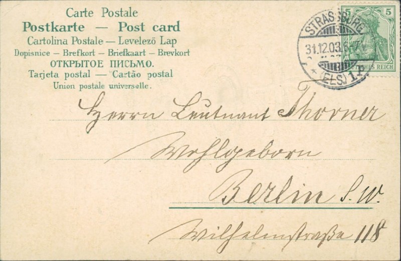 Alte Ansichtskarte, gelaufen am 31.12.1903 von Strassburg (Els.) nach Berlin S.W.