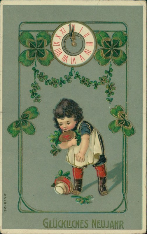 Kind mit Pilzen, Klee, Uhr