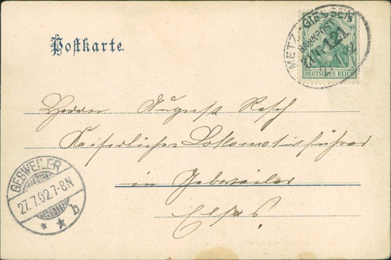 Alte Ansichtskarte aus Köln-Wahn, gelaufen am 27.07.1902 von Metz-Giessen (Bahnpost Zug 121) nach Gebweiler. Ankunft in Gebweiler am 27.07.1902.