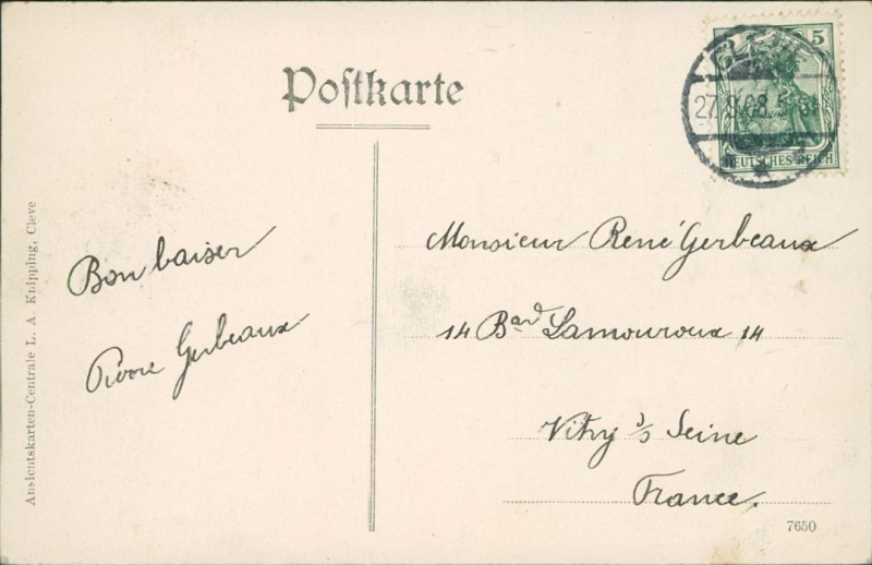 Alte Ansichtskarte aus Kleve, gelaufen am 27.09.1908 von Cleve nach Vitry.