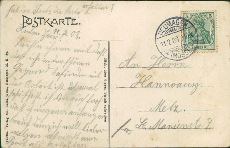 Alte Ansichtskarte aus Neumagen-Dhron, gelaufen am 11.02.1908 von Neumagen (Mosel) nach Metz.