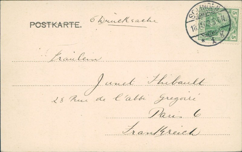 Alte Ansichtskarte aus Solingen, gelaufen am 18.11.1903 von Solingen nach Paris.