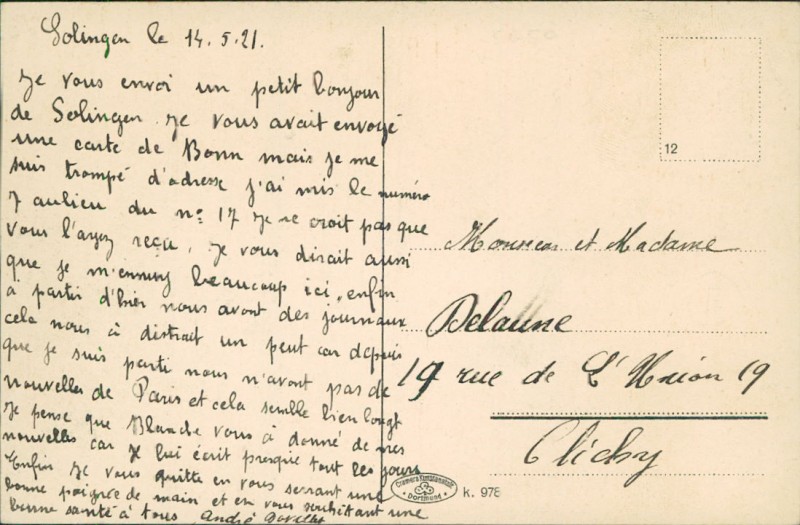 Alte Ansichtskarte aus Solingen, beschrieben am 14.05.1921.