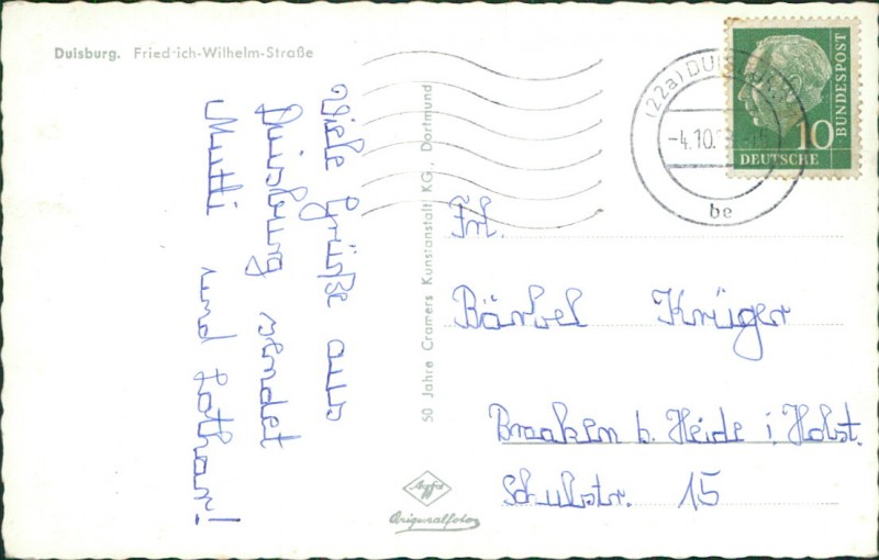 Alte Ansichtskarte aus Duisburg, gelaufen am 04.10.1958 von Duisburg nach Braaken.