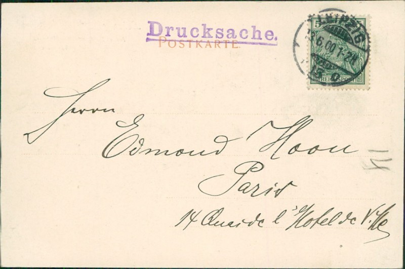 Alte Ansichtskarte aus Leipzig, gelaufen am 13.06.1900 von Leipzig nach Paris.