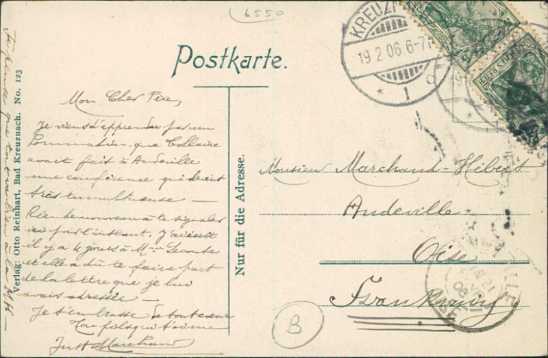 Alte Ansichtskarte aus Bad Kreuznach, gelaufen am 19.02.1906 von Kreuznach nach Audeville.