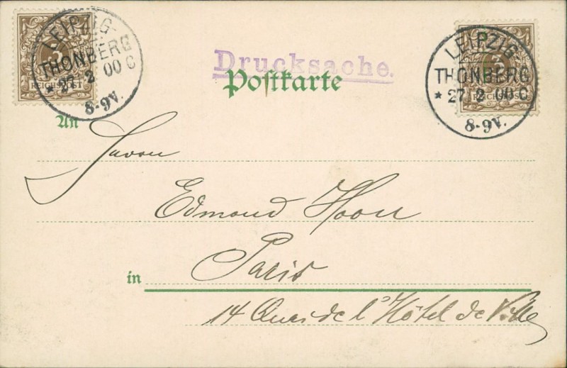 Alte Ansichtskarte aus Leipzig, gelaufen am 27.02.1900 von Leipzig Thonberg nach Paris.