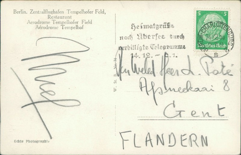 Alte Ansichtskarte aus Berlin, gelaufen am 24.02.1938 von Berlin-Charlottenburg nach Gent.