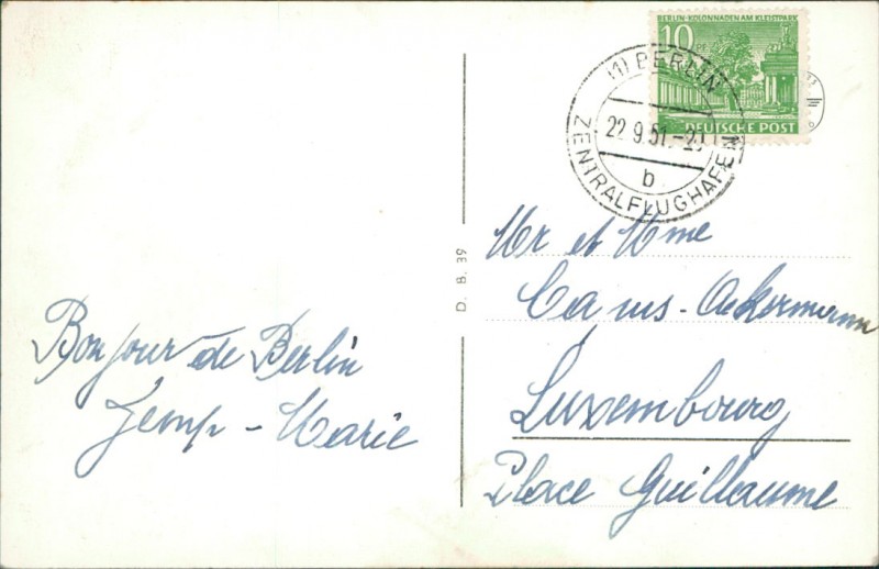Alte Ansichtskarte aus Berlin, gelaufen am 22.09.1951 von Berlin Zentralflughafen nach Luxembourg.