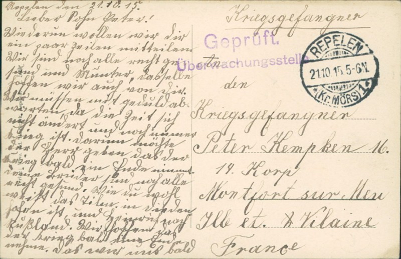 Alte Ansichtskarte aus Moers-Repelen, gelaufen am 21.10.1915.