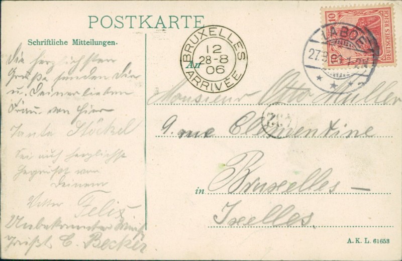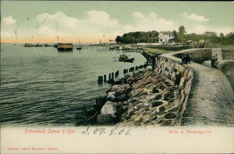 Alte Ansichtskarte aus Laboe (Probstei), gelaufen am 27.08.1906 von Laboe nach Bruxelles. Ankunft in Bruxelles am 28.08.1906.