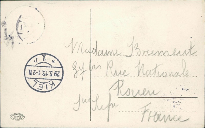 Alte Ansichtskarte aus Kiel, gelaufen am 29.05.1913 von Kiel nach Rouen.