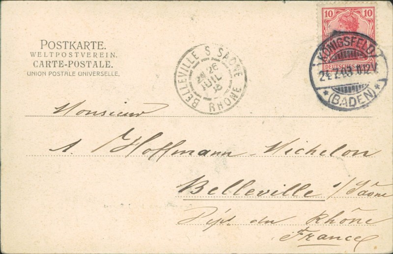 Alte Ansichtskarte aus Königsfeld im Schwarzwald, gelaufen am 24.07.1903 von Königsfeld (Baden) nach Belleville.