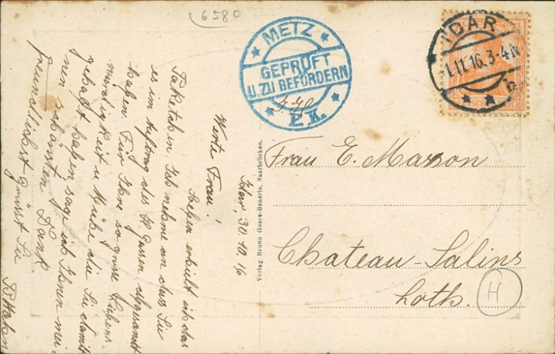 Alte Ansichtskarte aus Idar-Oberstein, gelaufen am 01.11.1916 von Idar nach Chateau-Salins.