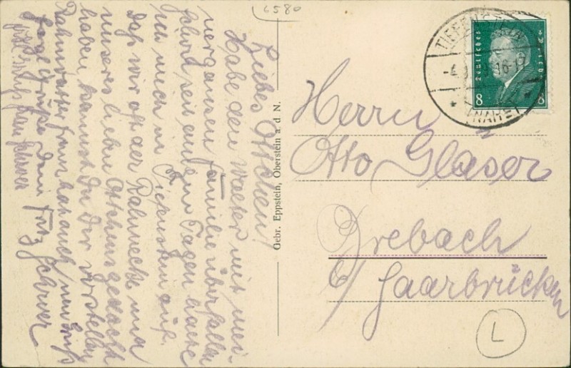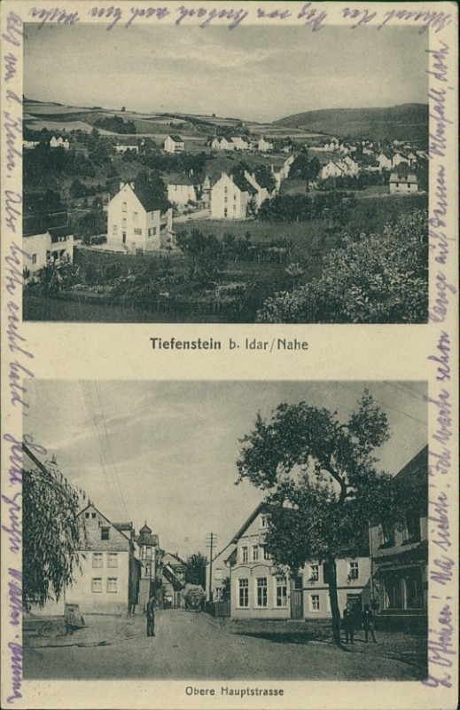 Alte Ansichtskarte aus Idar-Oberstein-Tiefenstein, gelaufen um 1929 von Tiefenstein (Nahe) nach Brebach b. Saarbrücken.