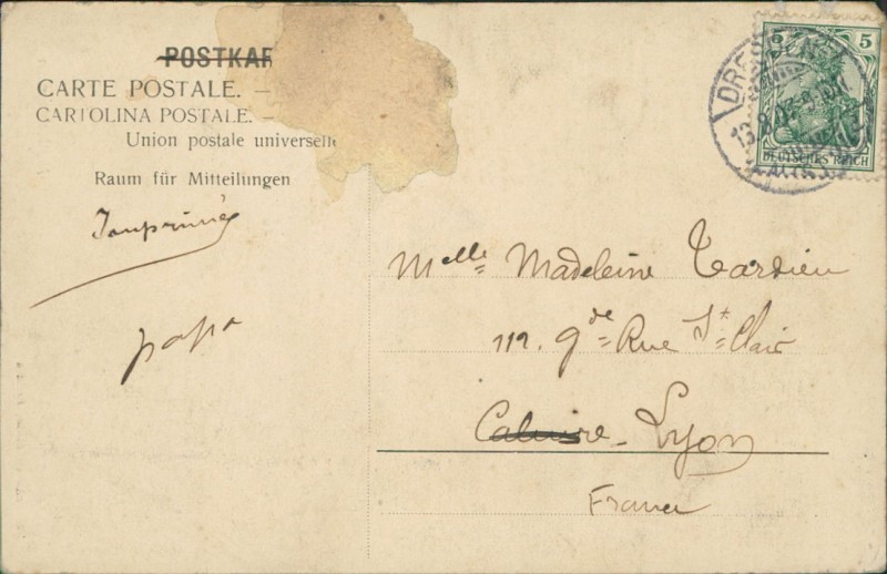 Alte Ansichtskarte aus Dresden, gelaufen am 13.08.1907 von Dresden Altst. nach Lyon.