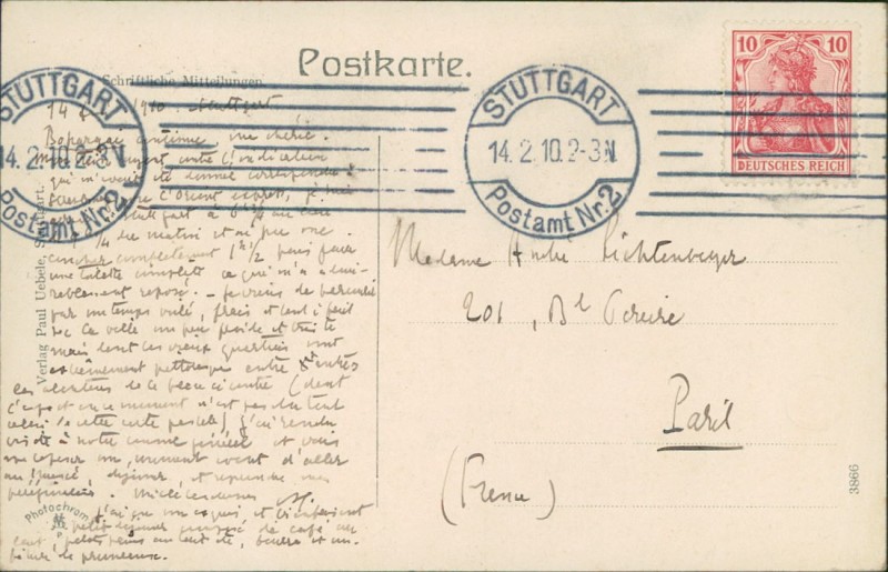 Alte Ansichtskarte aus Stuttgart, gelaufen am 14.02.1910 von Stuttgart nach Paris.