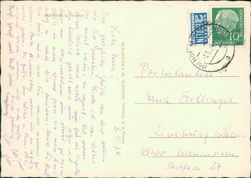 Alte Ansichtskarte aus Hofheim am Taunus, gelaufen am 05.10.1954 von Hofheim (Taunus) nach Limburg/Lahn.