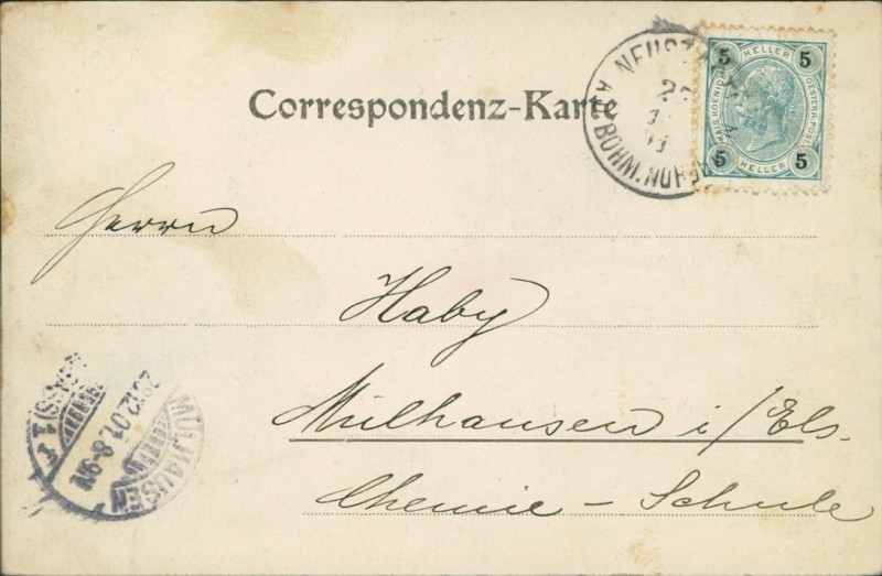 Alte Ansichtskarte aus Neustadtl / Nové Město pod Smrkem, gelaufen um 1901 von Neustadtl Böhm. Nordbahn nach Mülhausen i/Els. Ankunft in Mülhausen i/Els. am 28.12.1901.